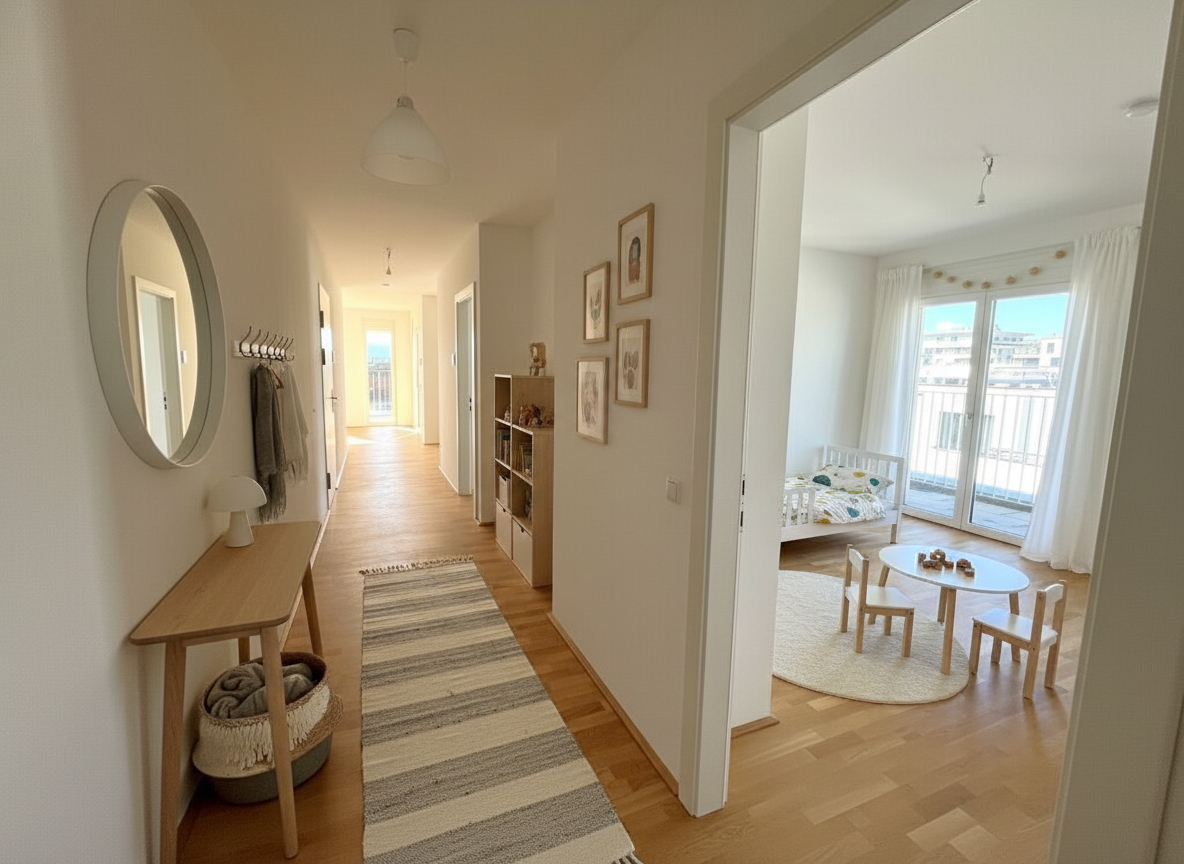 Außenbereiche mit Gemeinschaftsgarten, kleinem Spielplatz und grünen Aufenthaltszonen schaffen Raum für Entspannung und Begegnung.